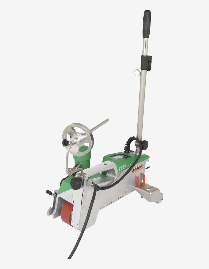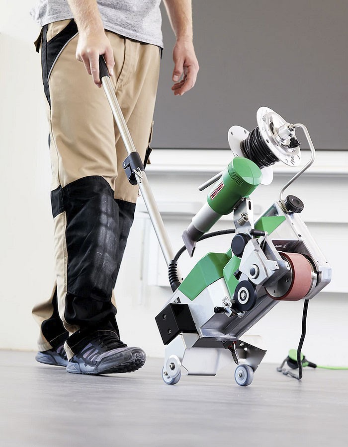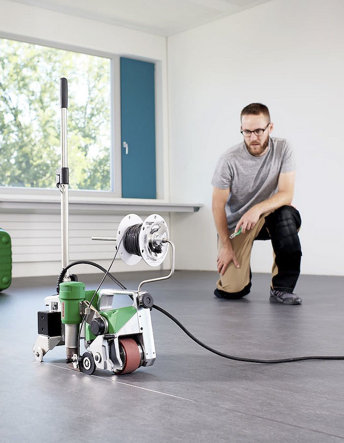 The hot-air blower also rotates out automatically when obstacles are touched, e.g. if the hot-air blower comes into contact with a wall, which almost completely eliminates damage to the flooring. This makes the UNIFLOOR 500 a particularly innovative and reliable automatic welding machine. When designing the UNIFLOOR 500, the focus was not only on technical requirements but also on user-friendliness. For this reason, the automatic welding machine has a guide rod and smooth transportation wheels, so that it can be moved effortlessly from seam to seam. This pays off especially when laying elastic and antistatic floor coverings in large buildings such as schools and hospitals. Leister's automatic floor welding machine is also very well suited for laying particularly large and durable industrial floors. Like the majority of Leister's automatic welding machines, stationary welders and heat guns, the UNIFLOOR 500 always has a brushless drive and blower motor, which makes it particularly durable and quiet. When the tools is in the rest position, the air volume of the hot-air blower is automatically reduced, lowering noise emissions to a minimum. The three parameters required for correct welding, temperature, speed and air volume, are clearly shown on the display and are easy to set. Different welding rod diameters such as 5 mm, 4 mm and 3 mm were also taken into account in the development of this floor welding machine. This is because the contact pressure of the pressure roller can be regulated with an adjusting screw.: In addition, the pressure roller can be folded up, allowing the welding rod to be inserted easily and without tilting the UNIFLOOR 500. An additional flap attached to the pressure roller reduces the amount of preheating air for reliable grouting of natural linoleum and rubber floor coverings. The welding rod roll holder has been optimized in comparison to the predecessor models, UNIFLOOR E/S. This enables it to be quickly and easily attached with a screw. Thus, all common welding rod rolls or welding rod spools on the market can be optimally positioned on the holder. In addition, a side cutter has been integrated into the transport axis, so users always have the right tool on hand to cut the welding rod at the end of the joint. All these advantages make the UNIFLOOR 500 a practical automatic welding machine that is perfectly suited for professional floor installations. In addition, the joints in the respective coverings are waterproof and germ-free, as well as quickly and effectively welded or grouted, depending on the requirements.