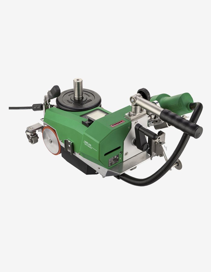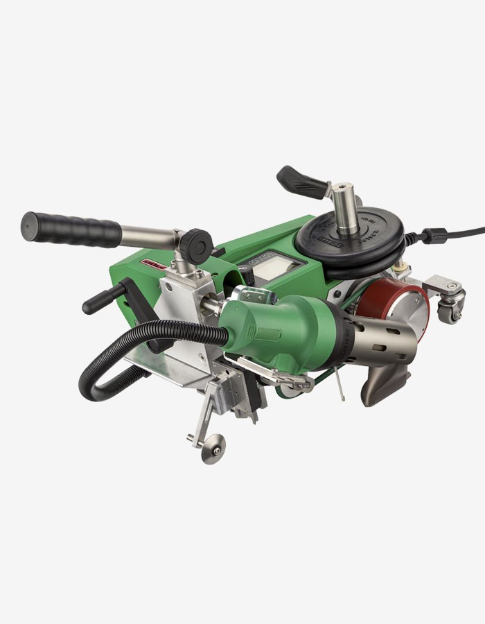 Automatic single motion nozzle engagement offers increased process safety. An advantage is the manually, adjustable swivel wheel on the UNIPLAN 500, which prevents annoying snagging on lugs, rivets, and tensioning hooks when welding. Another advantage of the UNIPLAN 500 is the simple operation via display with e-drive. The drive and temperature are controlled and the parameters can be stored. It is easy to switch between overlap welding and hem or pipe welding. Various accessories are included with the UNIPLAN 500: In addition to a transport box and overlap guide, extra weights (1.25 kg or 2.76 lb each), including weight holder, a brass brush, a short handle with console, a nozzle adjustment gauge and an additional hem guide are included.